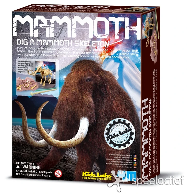 4M Kidzlabs Graaf-Je-Dinosaurus-Op – Mammoet: graaf het geraamte van een mysterieus voorhistorisch dier op: de mammoet. Wees een echte paleontoloog. Dit pakket bevat een gipsblok en een speciaal ontworpen graafwerktuig om je uren van paleontologenplezier te bieden. Wanneer je alle stukken van het geraamte hebt gevonden, volg je de handleiding om de dinosaurus op te zetten. Stel hem daarna tentoon zodat iedereen hem kan bewonderen. Daag uw vrienden en familie uit om mee te doen aan de ingesloten KidzQuiz (10 vragen en antwoorden) en leer tegelijkertijd zelf ook interessante feiten bij. Dit pakket bevat 1 blok uitpleisterkalk waarin een skelet van een wolharige mammoet begraven ligt, 1 graafinstrument, 1 borstel, 1 soort zachte was om het skelet te herstellen en gedetailleerde instructies voor het graven en de opbouw van het skelet.