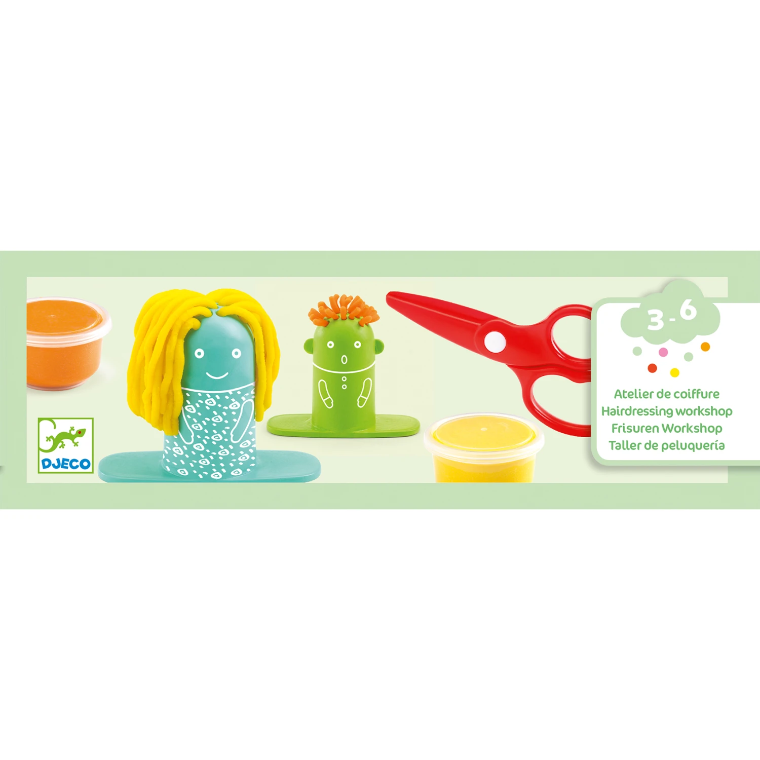 Leuke klei-activiteit voor kinderen van 3 – 6 jaar. Het kind speelt kappertje; Plaats de plasticine in de poppetjes, zet deze op zijn sokkel en druk; het haar groeit uit het hoofd. Vervolgens pak je de schaar om de mooiste kapsels te maken.