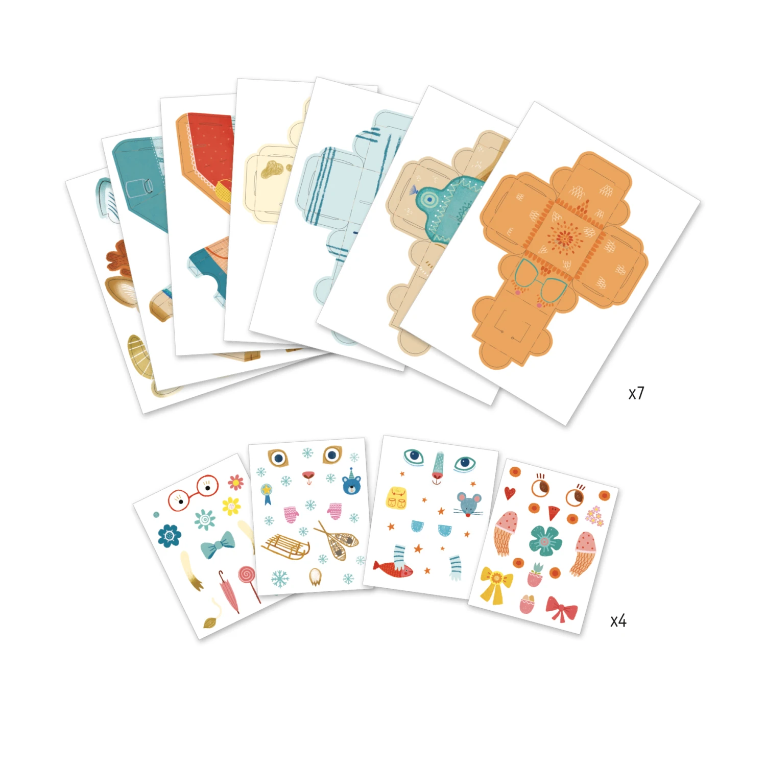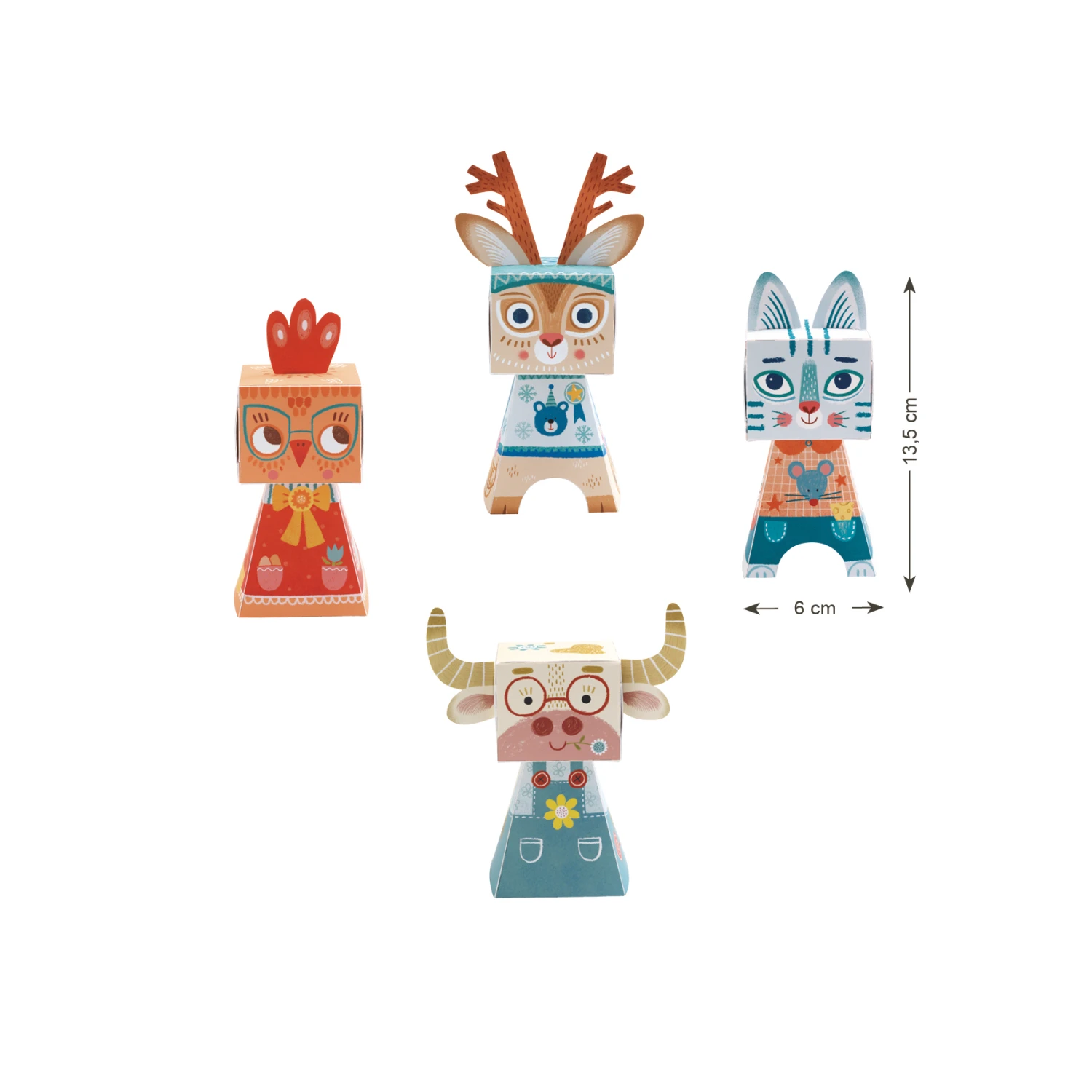 Een kleurrijk 3D knutselpakket. Versier de dieren met wrijfplaatjes en vouw ze in elkaar.