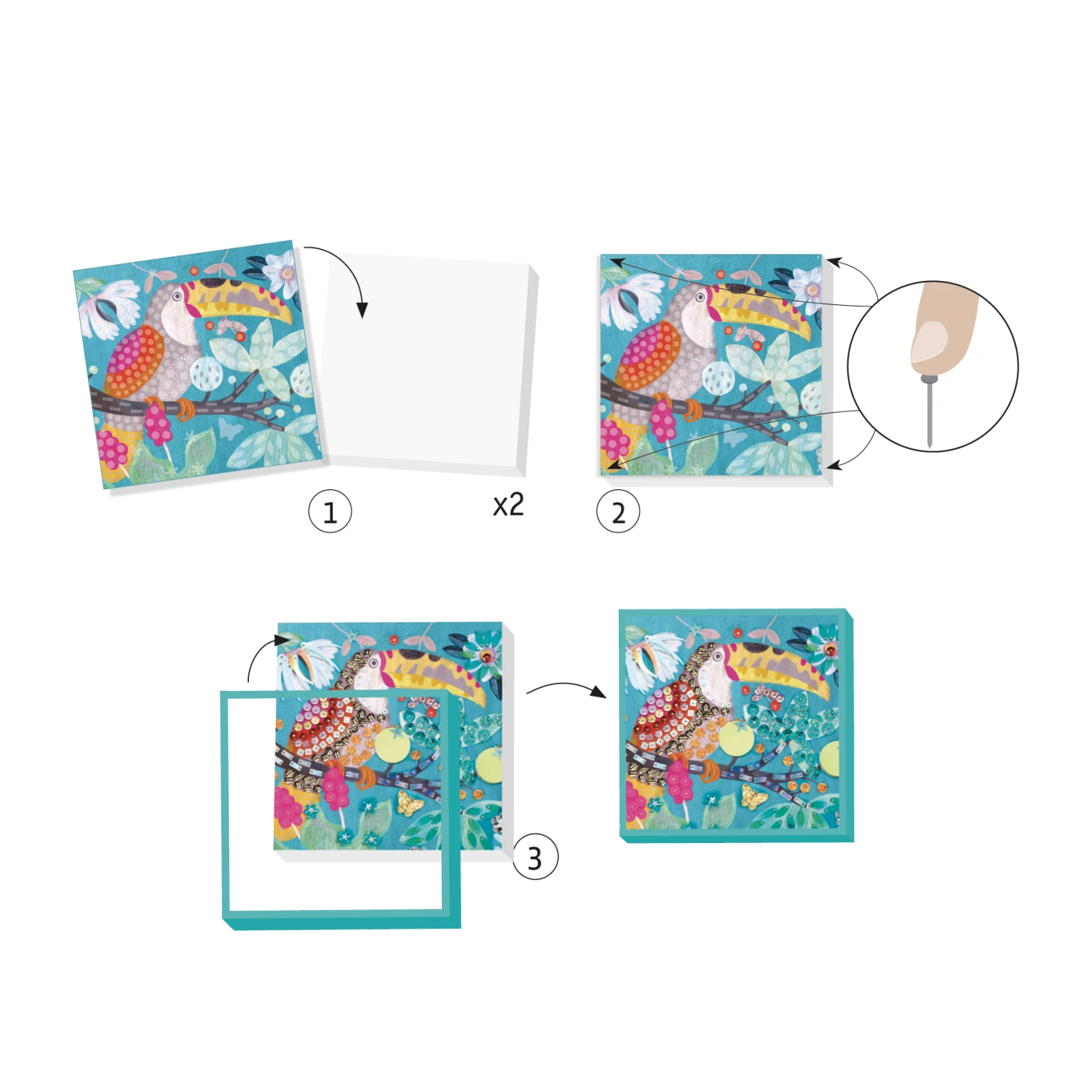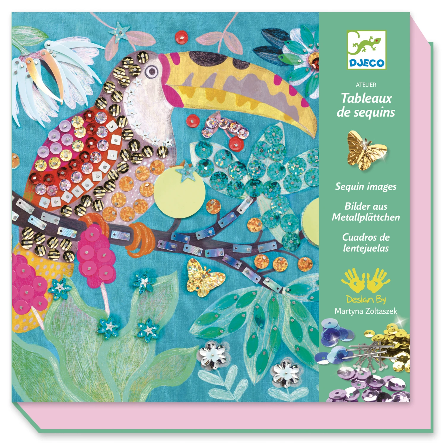 Exotisch knutselpakket van Djeco. Maak 2 schitterende schilderijtjes door de lovertjes met de kleine naaldjes op de gekleurde ondergrond vast te prikken. Volg hierbij de stappen in de bijgeleverde handleiding.