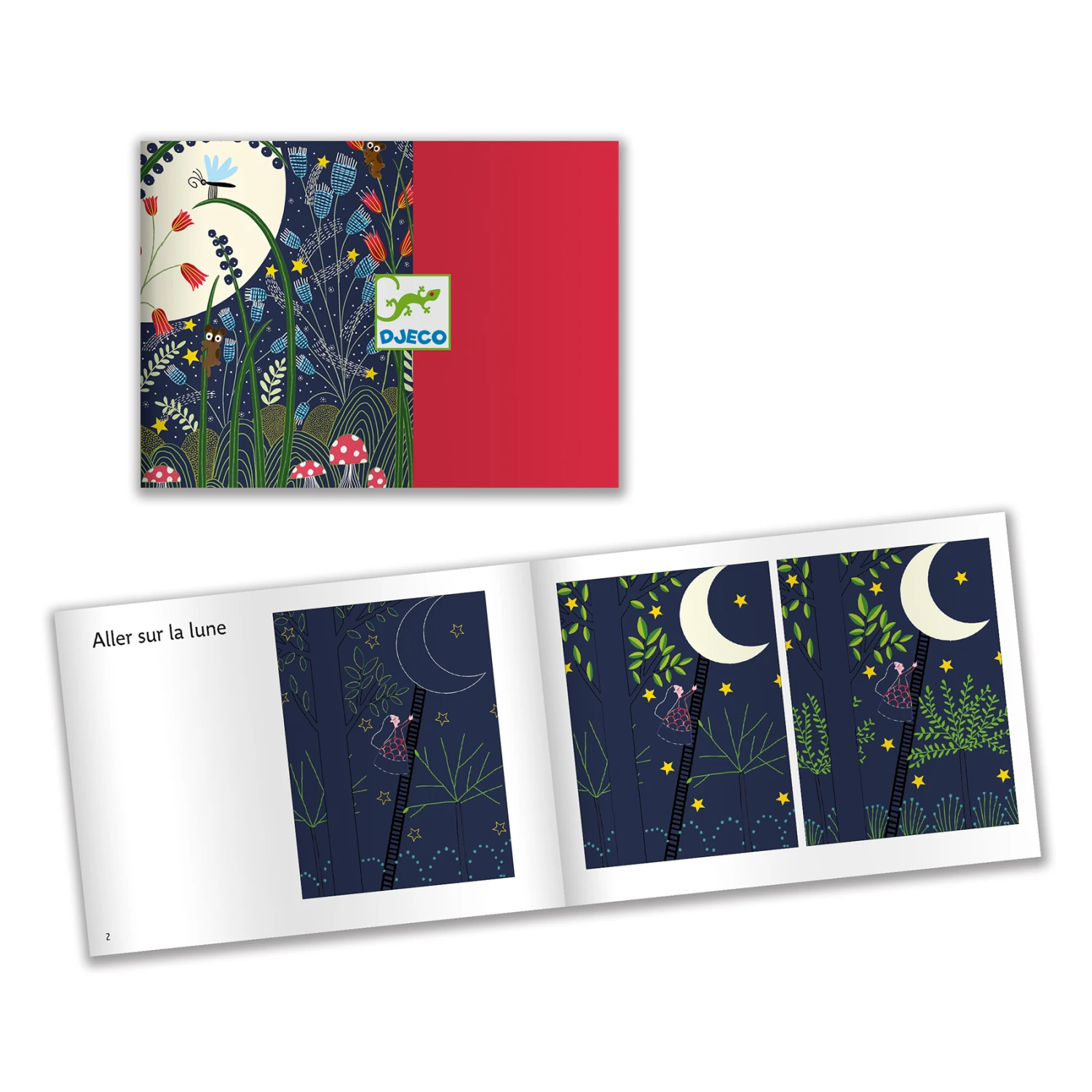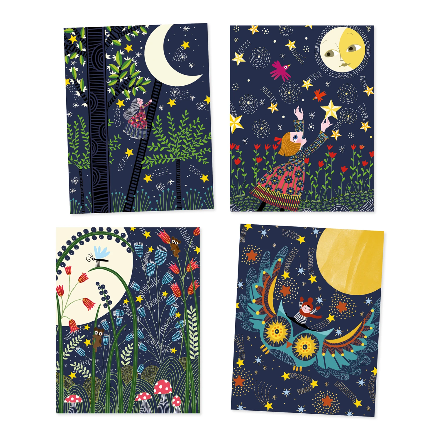 4 kraskaarten met stokje met afgeronde punt, geschikt voor kleine kinderen in het thema Nachtleven.