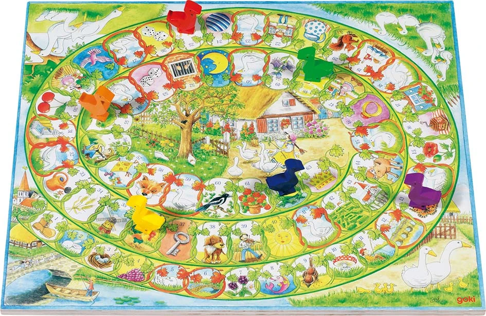 Op weg naar de ganzentuin passeer je een reeks velden, die je soms kunnen bevoordelen tegenover je medespelers, maar soms ook in je nadeel kunnen zijn. Pas op dat je je in de herberg niet teveel op je gemak voelt of dat je niet in de gevangenis belandt. Er zijn veel gevaarlijke momenten in het leven van een gans. Voor 2 – 6 spelers.