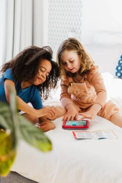 Spannend spel voor 2 spelers, leuk en leerzaam tegelijkertijd. Trek een patroonkaart uit de stapel, leg deze open op tafel en start. Elke speler probeert met de 2 kubussen en een spiegel het spiegelbeeld van het patroon te maken. Diegene die daar het eerst in slaagt, krijgt het patroonkaartje. Je wint wanneer je aan het einde de meeste patroonkaartjes hebt verzameld.