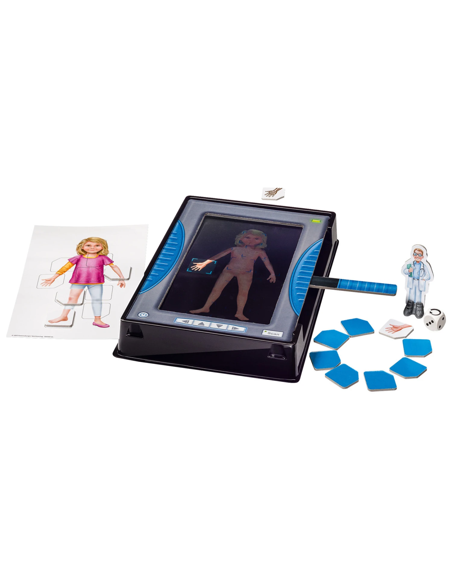 Kijk goed en onderzoek het lichaam. Wil je weten hoe de botten van je hand of de spieren van je been eruitzien? Onderzoek met de onderzoekstaaf huid, spieren en botten. Heb je de plaats van het lichaam in het röntgenapparaat gevonden? Laat nu zien, waar deze plek in je eigen lichaam zit en zwaai met dat gedeelte van je lichaam.