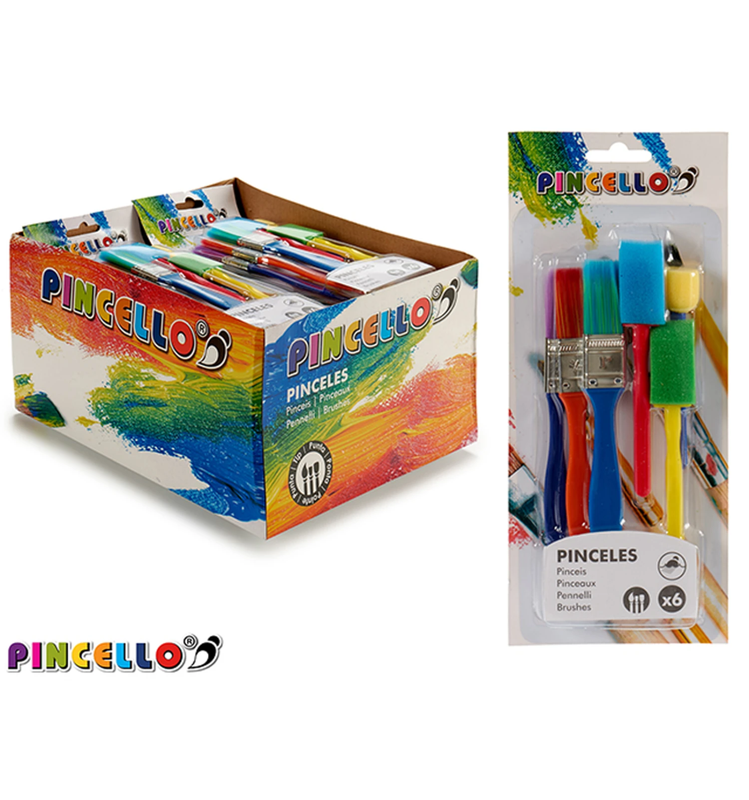 Set van 3 platte kwasten, 2 platte en 1 ronde spons van Pincello in vrolijke kleuren, geschikt voor kinderen.