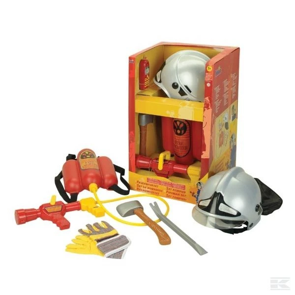 Luxe brandweerset met echte “nederlandse” brandweerhelm, rugspuit, bijl, breekijzer, werkhandschoen en mobiel.