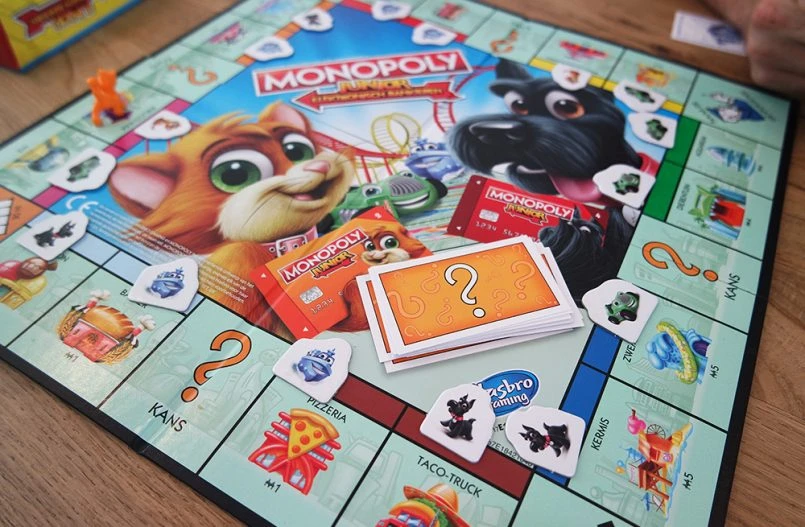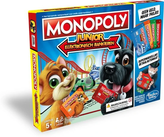 Het klassieke Monopoly Junior spel heeft een nieuw jasje: Elektronisch Bankieren! Het biedt kinderen een eigentijdse bankervaring omdat het geld is vervangen door een elektronische bankautomaat en door Monopoly bankpasjes. Gebruik de pasjes om vakjes te kopen, huur te betalen en om geld te ontvangen als je over Start gaat. En dat allemaal met de 4 favoriete pionnen: Kleine Mollie, Kleine Dwarrel, Speelgoedauto en Speelgoedboot. Bekende en geliefde vakjes zoals de ijssalon, de speelgoedwinkel en de kermis zijn ook in deze versie te kopen door kids. Ze vinden het geweldig om de bankpasjes te gebruiken en hun ‘verkocht’ bordjes op hun eigen vakjes te zetten. Wie van de kids heeft er aan het eind van het spel het meeste geld? Die speler heeft gewonnen!